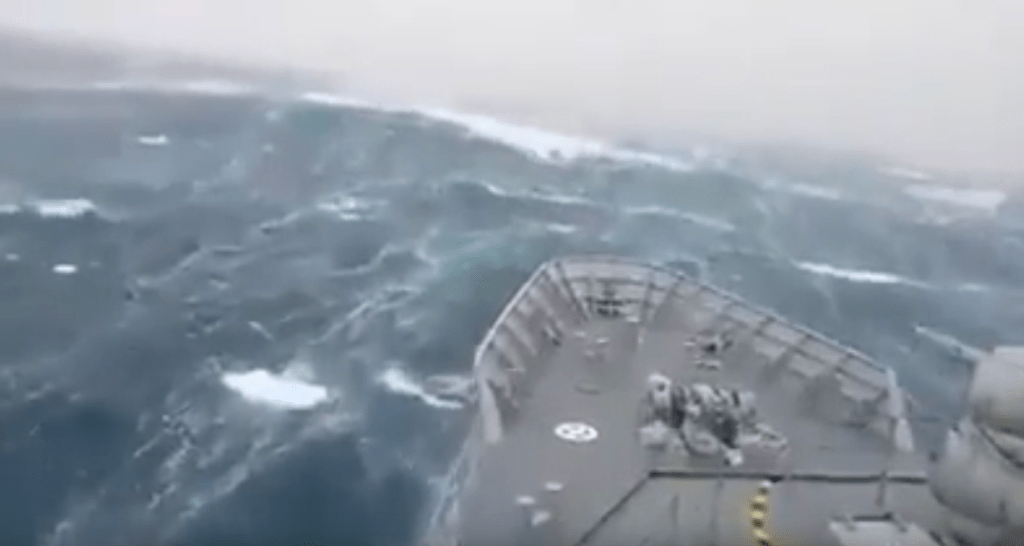 Meanwhile, the deck apes were down below the main deck which was open with railings. They had secured themselves with small stuff (Navy jargon for what we call ropes) and they were just washing around down there having fun in their own way. Crazy. Another way to deal with fear.